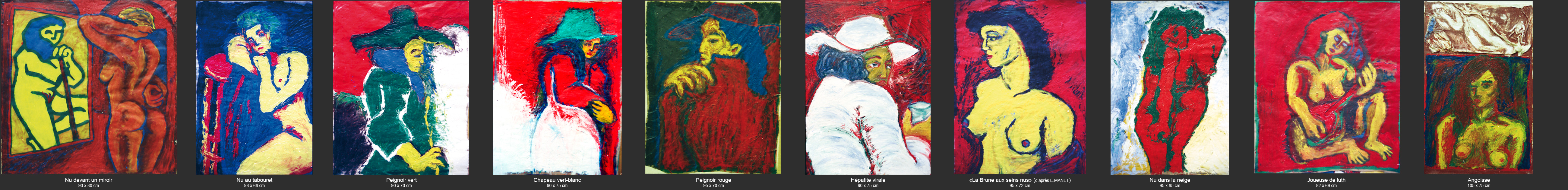 Paris 1987/1988 - Nus et Habillés. « Si la pratique de l’imitation fait tort à l’instruction, " Ce fut donc pour moi une révélation que de dessiner en contemplant « sur nature ». Avec ces dessins et le sentiment persistant de la chair, de la lumière sur la peau et d’autres choses tenant aux nerfs, je commençais à matérialiser en couleurs et matière, concrètement, le monde noir et blanc que j’avais réalisé d’une manière toute intérieure et confuse (Vous remarquerez que le blanc n’est jamais utilisé ici pour éclaircir, mais comme une couleur à part entière). Le Greco, Goya, Delacroix, Van Gogh, Munch ou Vlaminck, prenaient une dimension que je ne soupçonnais qu’à peine. Ils furent mes maîtres bien plus que ceux de l’école, je veux dire qu’ils furent plus pertinents." |